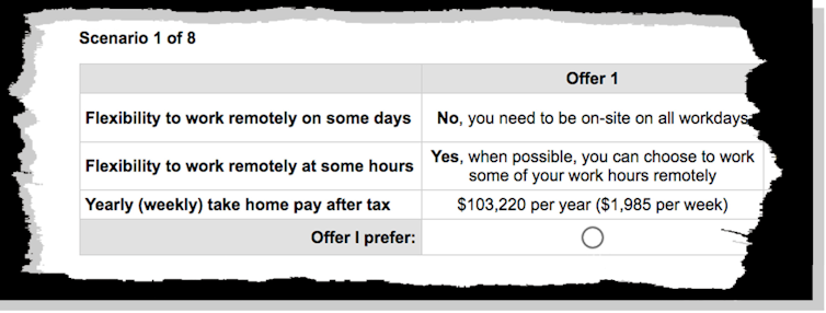 Ofrecimos a los trabajadores encuestados una opción de ocho arreglos de trabajo con diferentes rangos salariales calculados con narración a sus salarios actuales y diferentes grados de flexibilidad sobre el trabajo desde casa.